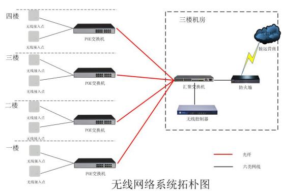 無線網(wǎng)絡(luò)采用無線接入點(AP) +無線控制器(AC) 的企業(yè)級無線網(wǎng)絡(luò)系統(tǒng)架構(gòu),星型拓撲結(jié)構(gòu)。在